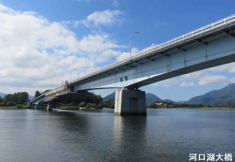 甲府方面から車で河口湖大橋にさしかかると、天気の良い日には大きな富士山が目に飛び込んできます。歩道もある橋なので散歩にも最適で、河口湖も見渡せとても気持ちの良い富士山ビューのスポットです。ただ、橋を渡る車のドライバーも、天気が良いと富士山に目をとられたりよそ見をすることもありますので、くれぐれも車道には出ないよう歩行には十分に注意しましょう。