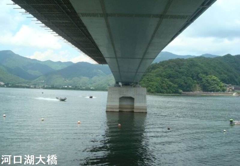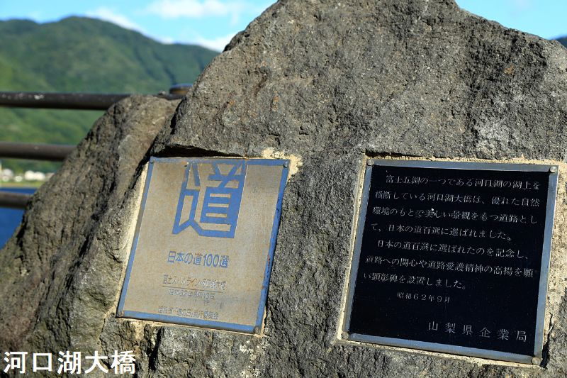河口湖大橋は、国立公園特別地域に建設されるものとしては日本で初めての橋でした。1987年には、優れた自然観光のもとで美しい景観をもつ道路として富士スバルラインとともに「日本の道100選」に選ばれており、石碑も設置されています。石碑は橋の南側入り口、富士山側にあります。富士五湖の一つである河口湖の湖上を横断している河口湖大橋は、優れた自然環境のもとで美しい景観をもつ道路として、日本の道百選に選ばれました。日本の道百選に選ばれたのを記念し、道路への関心や道路愛護精神の高揚を願い顕彰碑を設置しました。