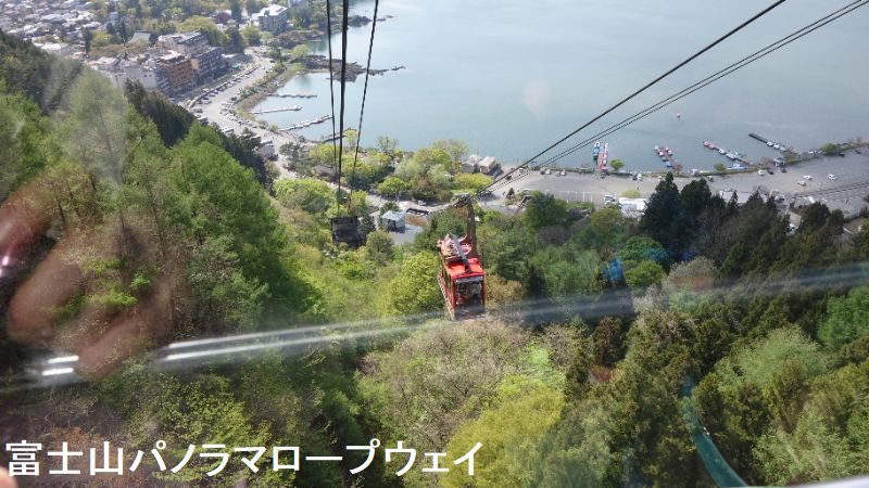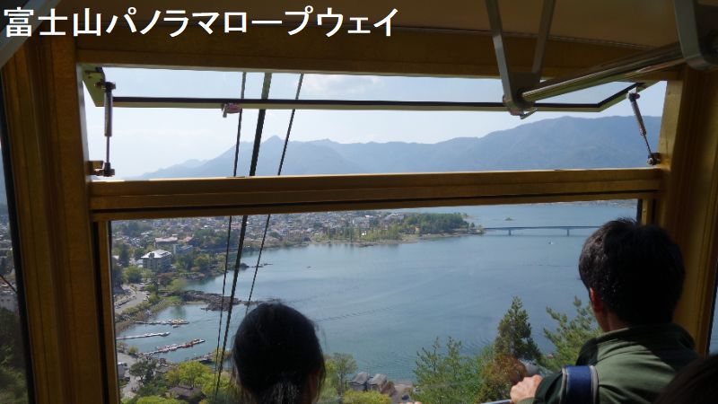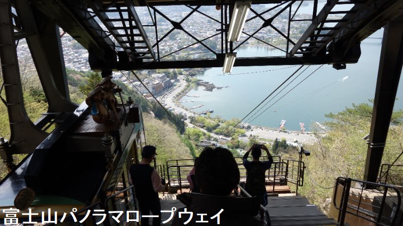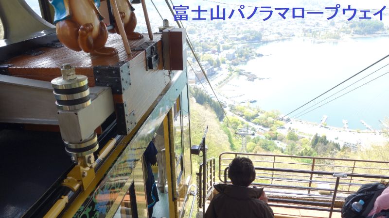 ロープウエーは全長460メートルです。2台のゴンドラの屋根にはそれぞれ、タヌキとウサギの人形が乗っています。湖畔駅(標高856メートル)から富士見台駅(同1075メートル)までは標高差219メートル。2分20秒(2021年8月設備更新による)で乗客を運んでくれる。ゴンドラからは天気が良ければ、富士山や河口湖の雄大な景色が一望できるます。