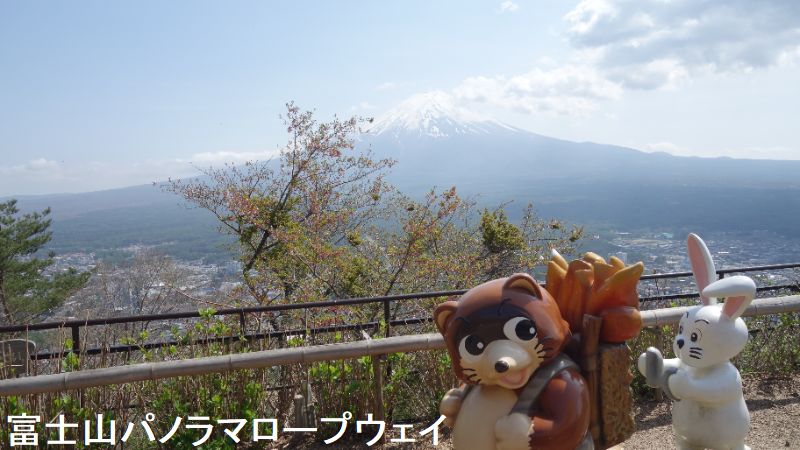 太宰治の小説「カチカチ山」の舞台とされる富士河口湖町浅川の天上山は、その山頂近くにある展望広場と河口湖畔をつなぐ「河口湖 富士山パノラマロープウェイ(2018年4月、「天上山公園カチカチ山ロープウェイ」から名称変更)」では、小説に登場するウサギとタヌキの人形が訪れる人を出迎えてくれます。