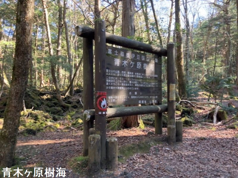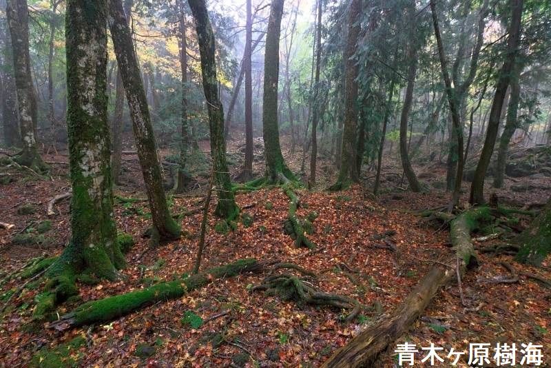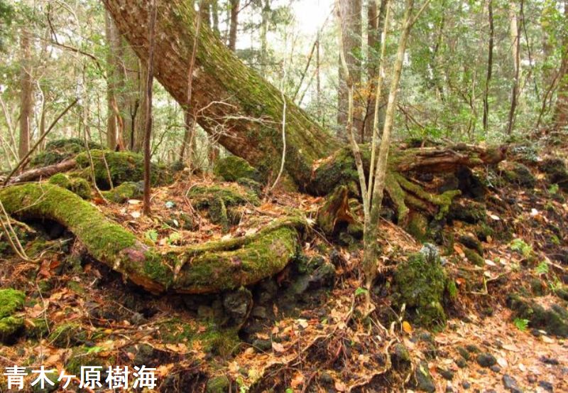 西暦864年の貞観噴火(富士山の側火山である長尾山で発生)により、膨大な溶岩を流し森林地帯を飲み込み焼き尽くし、それでも収まらず富士山の北西にあった広大な湖「セの海」に流れ込みました。「セの海」に溶岩が流れ込んだ結果、現在の精進湖・西湖に別れさせました。(面白いことに湖の標高は900mで同じ。)溶岩の流れた溶岩地帯が青木ヶ原樹海の始まり。溶岩地帯は、すべてを焼き尽くされ何もない場所になりました。冷え固まった溶岩しかない土地に、年月をかけて苔が生えては枯れて生えては枯れて・・・を繰り返し少しの土ができ、その土に草が生えて枯れて・・・を繰り返し少しの土ができ、ようやく木がギリギリ育つことのできる環境ができました。木が芽吹きだした時期は、今から300年ほど前からだといわれています。現在の青木ヶ原樹海は、冷え固まった溶岩の上に生えた苔から始まり、1200年の年月をかけてできています。