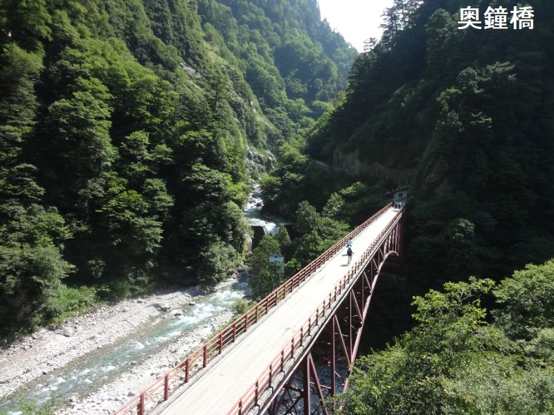 欅平ビジターセンターは黒部峡谷の自然や景観を展示紹介する施設です。周辺の見どころや自然情報、登山道の状況などの情報を発信しているので、散策前に立ち寄りましょう。欅平から祖母谷温泉方面に向かっていくと現れるのが、奥鐘橋です。黒部川本流にかかる高さ34m、長さ86mの橋で、ここから望む峡谷の景色は格別です。