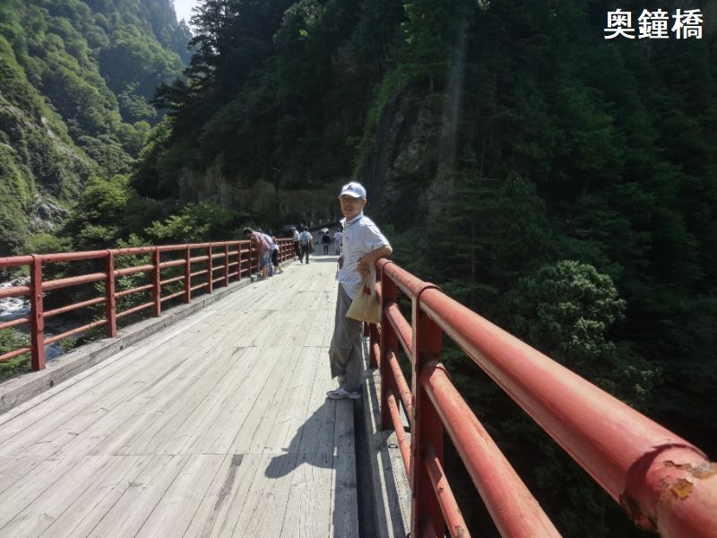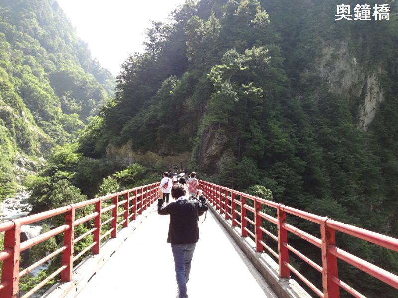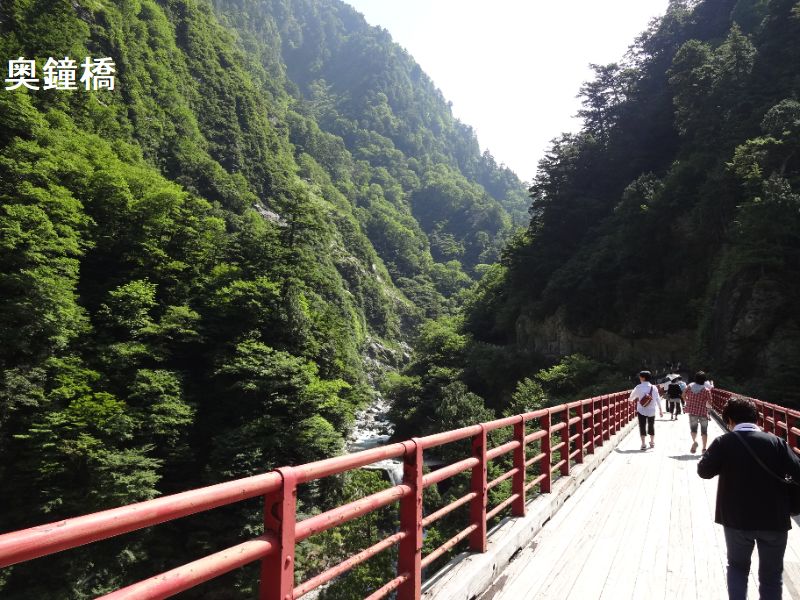 奥鐘橋は、黒部川の本流にかかる橋です。緑豊かな景観に、朱色の橋がとても映えます。奥鐘山や名剣山などを見渡すことができ、絶景を堪能。祖母谷温泉方面へ歩いていくと、岸壁がせり出したような「人喰岩」や、無料の足湯を楽しめる「河原展望台」に辿り着きます。春は残雪と新緑を、夏は河原で水遊び、秋は幻想的な紅葉を楽しめます。