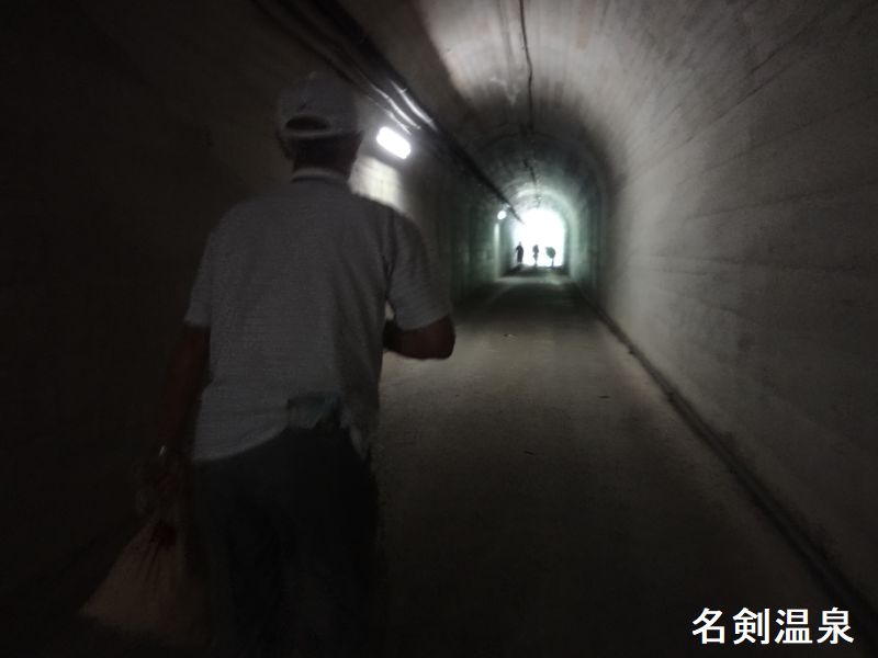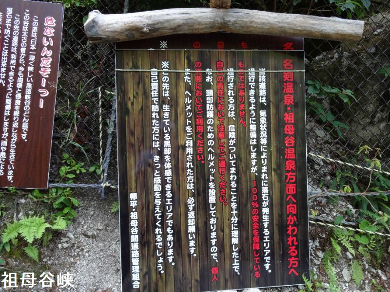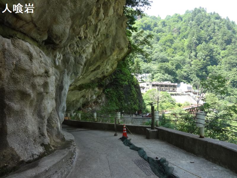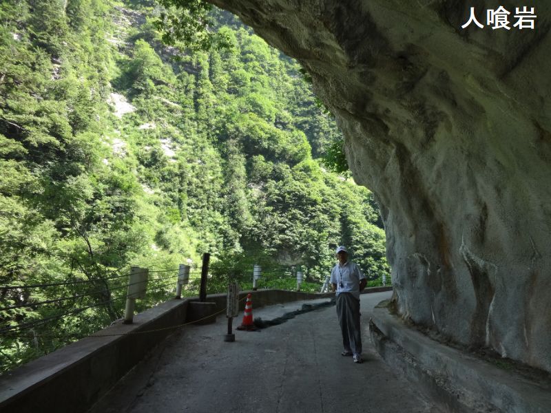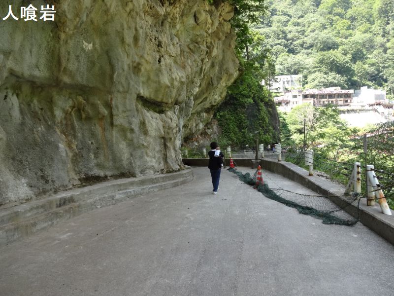 巨大な岩をくりぬいた道の手前には、ヘルメットが用意されていますが、これは落石防止と、露岩に頭をぶつけることの防止からです。人喰岩の先には日中なら日帰り入浴も可能な名剣温泉(源泉は祖母谷温泉)があります。欅平駅から名剣温泉旅館までは徒歩15分。白馬岳・唐松岳の登山口でも有る祖母谷温泉(山小屋)へはさらに徒歩35分です。