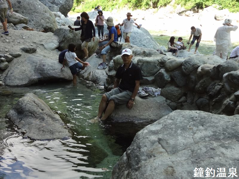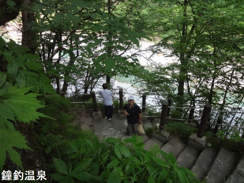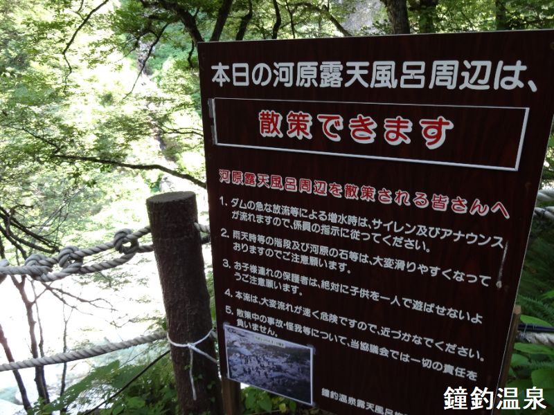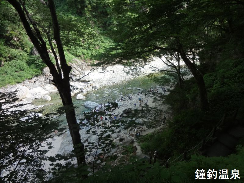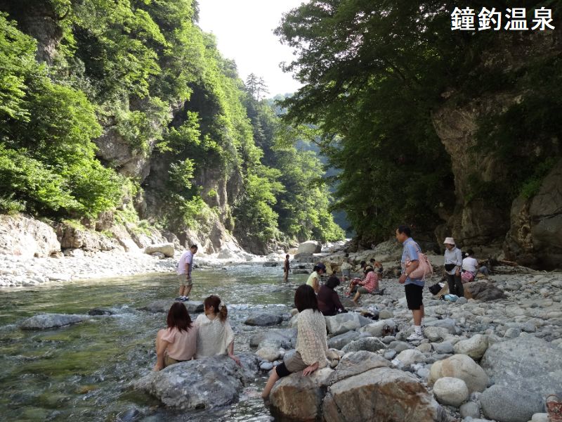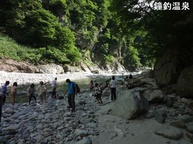 鐘釣温泉は鐘釣駅のすぐ下にあり、階段を下りていくと河原から湯気が立ち上っているのが見えます。鐘釣駅から歩いて20分程の場所に、付近の温泉旅館が管理している 「河原露天風呂」があります。旅館の宿泊客が利用できるだけでなく一般にも開放されており、岩で囲まれただけの開放感あふれる露天風呂を楽しめる他、旅館でスコップを借りて 河原を掘り自分だけの露天風呂をつくることもできます。