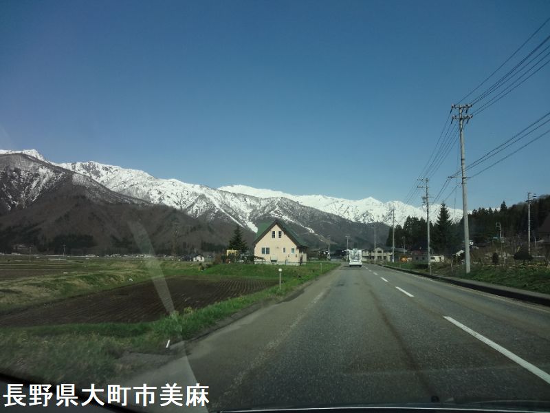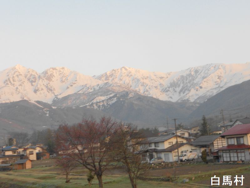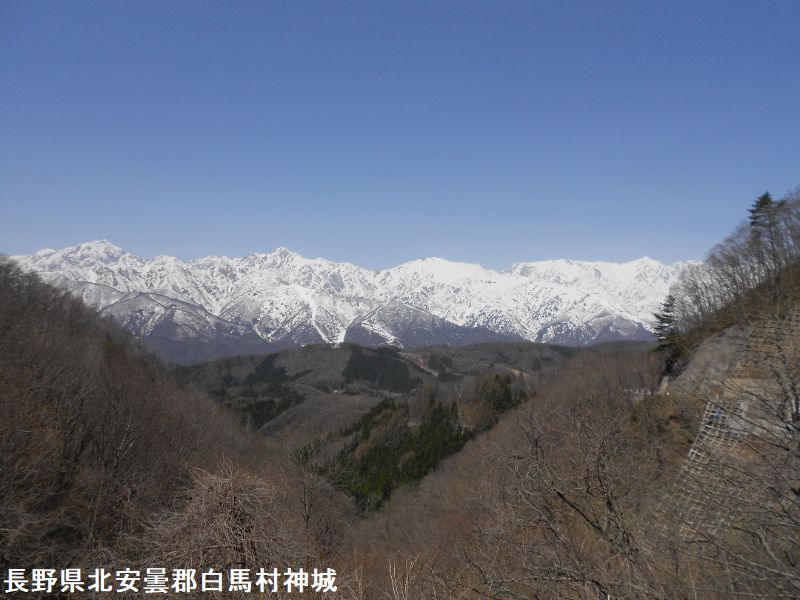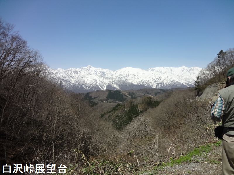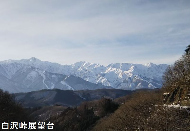 白沢峠は、白馬から国道406号線で鬼無里・戸隠・長野方面へ向かう途中にある峠です。1,000mを超える標高から、鹿島槍ヶ岳、五竜岳、唐松岳、白馬三山など北アルプスの山々を一望するパノラマを楽しめます。車でアクセスできる絶景スポットとして人気で、早朝には朝日を浴びる美しい山々の姿も拝めます。一番右の白馬岳は手前の山の稜線の木々に隠れていて見えません。白沢トンネルの手前に砂利の駐車場(5台程度のスペース)があります。長野・戸隠側から向かうとトンネルの中を走っている途中から、北アルプスの絶景が目に飛び込んできます国道406号線は幅が狭いので運転には注意しましょう。