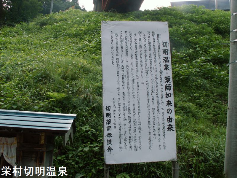 鈴木牧之は、文政11年(1828)に当地を訪れ、「湯本」として、その様子を『秋山記行』描いています。その際牧之は、切明の温泉は寛政6年(1794)に開かれたのだと聞きます。中津川左岸には温泉宿があり、その裏山には薬師様を祀った薬王閣を描いています。現在、その場所は、切明の発電所と導水管となっていて、中津川右岸に温泉宿が建ち、薬王閣も小さな祠として残っています。牧之が訪れてから19年後、弘化4年(1847)に起きた善光寺地震の際に、山崩れにより川が土砂でせき止められ、湖となり、温泉宿も湖底に沈んだという記録があります。翌、嘉永元年(1848)、ここを訪れた佐久間象山が工事を指導し、土砂を切り開いて排水したので、地名が湯本から切明になったと言われています