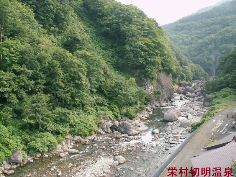 切明の川原を掘ると温泉が湧き出てきます。この温泉は、新第三紀後期に隆起した中央隆起帯と呼ばれ、500万年前に貫入した花崗岩の一種の石英閃緑岩との関係が考えられます。この温泉は、カルシウム・ナトリウム−塩化物・硫酸塩泉でおよそ56℃です。切明から雑魚川にかけて、緻密で平滑な節理が発達する石英閃緑岩が、結東層の変質火山岩を北北西−南南東方向に貫入しています。また、川原には、30メートルほどもある鳥甲溶岩の岩塊(安山岩)が点在しています。これらは、弘化4年(1847)の善光寺地震での山崩れの際に落石し、川をせき止めた跡と考えられています。