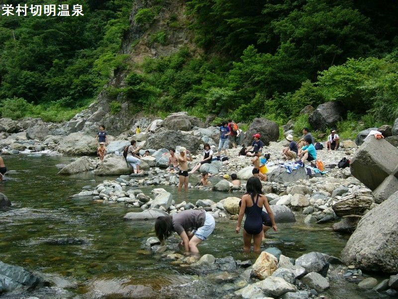 峡谷の秘境「秋山郷」の最深部、冬は豪雪地帯ながら、約1時間に1回は除雪車を稼動させ、2軒の宿の営みを維持しています。とは言え、半端な気持ちで行ける場所ではありません。中津川左岸川床の広範囲で熱い湯が沸いています。河原あちこちで温泉が湧き出ていています。ここではスコップ持参の人だけ湯船を作ることができます。お湯の温度は50度以上あるので水で埋めないと入れません。河原の湯船に川の水を引き込んで適温にします。湯船を実際に作るのは相当大変です。大きな石をかい出さなければなりません。
