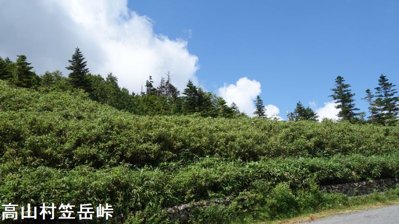 長野県の北東端、群馬や新潟との県境に近い山間部に志賀高原がある。ス キーの経験がないので冬場の様子はあまり分りませんが、夏場などには華やいだ観光地です。峠としても群馬との境にあの渋峠が存在します。標高が2152mと格段に 高く、国道第一の栄誉に輝いています。正確な志賀高原の範囲を知りませんが、渋峠から長野県の山ノ内町側に下って来た国道292号線の沿線に広がっているようです。また、山ノ内町からその南に隣接する高山村にまでに及ぶ範囲を南志賀とも呼ぶらしいです。笠ヶ岳峠はその南志賀のシンボル的存在ともなる笠ヶ岳の直ぐ脇を越える峠です。