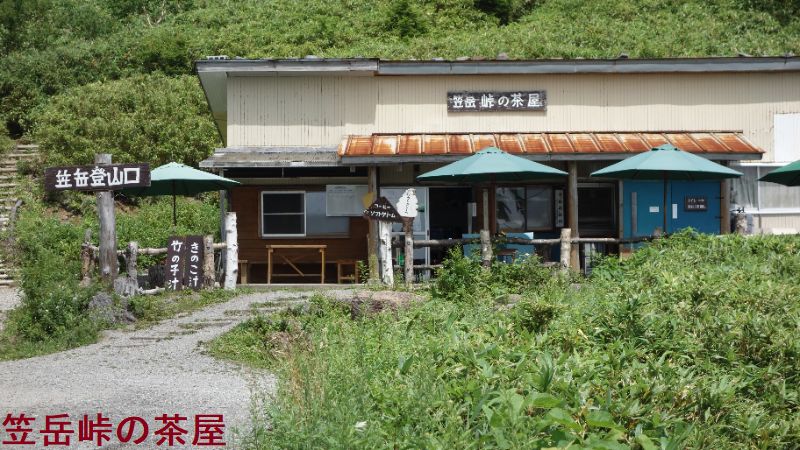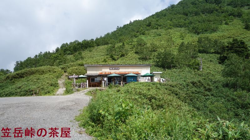 笠ヶ岳峠という名は、仮称と考えたほうが良さそうです。明確に笠ヶ岳峠と書かれている地図などは見たことがありません。ただ、峠には笠ヶ岳への登山客などの為の茶店が立ち、その店の看板に「笠ヶ岳峠の茶屋」とあります。これなら一般の道路地図にも掲載さ れています。しかし、このことから峠の名は「笠ヶ岳峠」 だと判断するのは性急です。「笠ヶ岳峠の茶屋」とは、「笠ヶ岳峠」の「茶屋」ではなく、「笠ヶ岳」の山の近くに立つ「峠の茶屋」という意味かもしれないのです。とは言え、他に適当な名前があるではなく、笠ヶ岳峠とは極めて無難な名称とも思えます。一応仮称と心得つつも、ここでは笠ヶ岳峠と呼ばれてもらうこととしました。