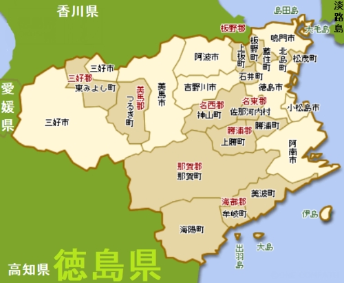 徳島県は、四国の東部に位置し、県庁所在地は徳島市です。 徳島平野を除けば、西日本でも有数の険しい山岳地帯が広がり、那賀川、吉野川、勝浦川などの水量豊富な河川が多く、豊かな自然に恵まれた県となりました。 また、温暖湿潤な気候や地質を活かした農産物の生産や畜産業が盛んに行われています。徳島県は、四国山地の北側と南側で大きく2つの気候区に大別されます。北部は典型的な瀬戸内気候に属し、温暖で全国的に見て少雨地域の部類であり、南部は典型的な太平洋気候に属して、四国山地の南東斜面を中心とした山地は、日本でも有数の多雨地域で台風や梅雨、秋雨の季節には記録的な降水量になることがあります。
