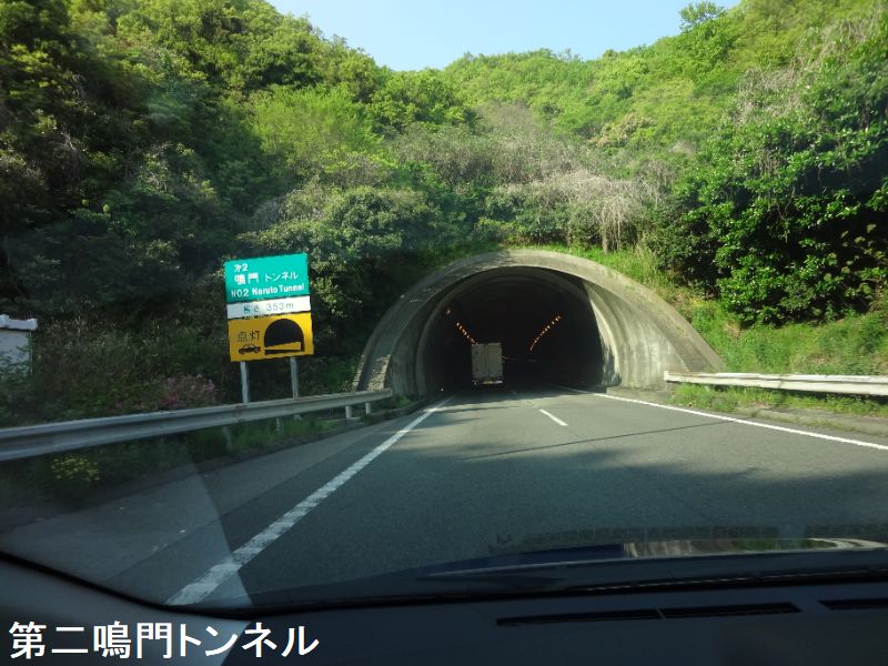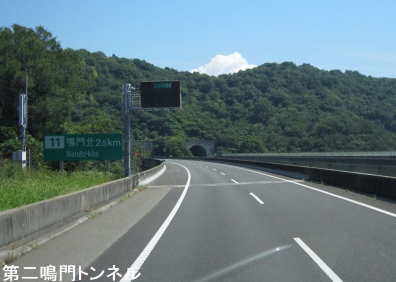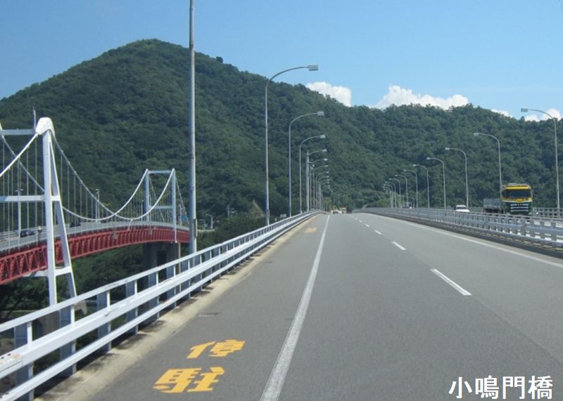 大毛島に2つあるトンネルは、本州・淡路島と異なり、第1・第2・撫養の3つは最初から片側2車線の幅員でしかありません。トンネルは狭いものの、橋梁や地上部は路肩が異様に広く作られています。何か理由でもあるのでしょうか。第2鳴門トンネルの長さは、374メートルです。大鳴門橋で最後の海峡かと見せかけて、小鳴門海峡を跨ぐ撫養橋を通過します。コレがホントの最後の海峡区間であり、隣に吊り橋の小鳴門橋が並走しています。