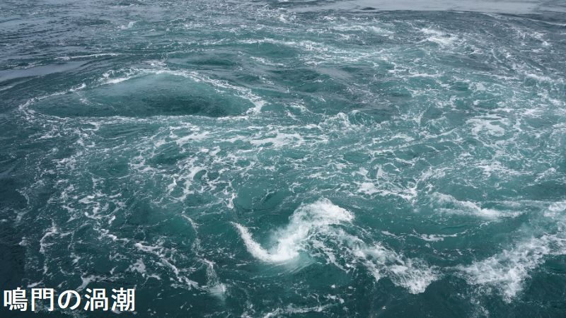 鳴門市孫崎と淡路島との間の鳴門海峡では、潮の干満によって渦潮が発生します。春と秋の大潮時に最大となり、潮流時速20km、最大直径20mにも及ぶものがあります。百雷のごとくすさまじい轟音を立てて渦潮が交錯しながら流れていくさまは壮観です。満潮と干潮は1日2回ずつあり、鳴門海峡ではこの満潮時と干潮時に渦潮が発生します。満潮時と干潮時の前後約1時間半が渦潮の見ごろといわれています。大鳴門橋の下で、ゴーッという音を立てながらぐるぐると回る渦が現れては消え、消えては現れます。大きさは大小さまざまです。小さな渦同士がくっついて大きくなったり、大きな渦が小さく分かれたりします。刻々と表情を変えるダイナミックかつ爽快な風景に圧倒されます。