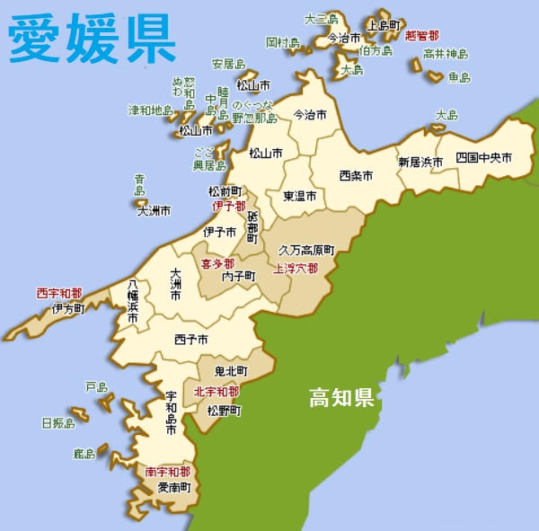 愛媛県は、瀬戸内海、宇和海には大小200余りの島々があり、海、山両方の豊かな自然に恵まれています。 気候は穏やかで、人口は約143万人(全国26位)、面積は5,678km2(全国25位)。 柑橘をはじめ海産物など特産品は豊富で、特にいよかんは生産量全国1位を誇っています。愛媛県は,1873(明治6)年2月20日,石鉄県と 神山県が統合されて誕生しました。 伊予国は藩政時代に八つの藩に分かれていましたから,県名を付ける際,ある特定の藩名や都市名を県名として採用するというわけにはいきませんでした。
