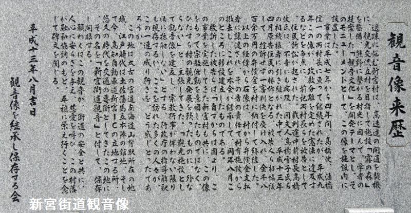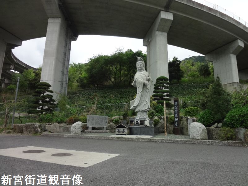 新宮街道観音像は、新宮村の歴史に因んで観音文化の象徴として設置されました。設置後に政教分離に反するとして住民訴訟が起き、村長が敗訴しました。当時は、全国放送の報道特集でも取り上げられました。観音像の上にあるのは高知道です。現在は、新宮