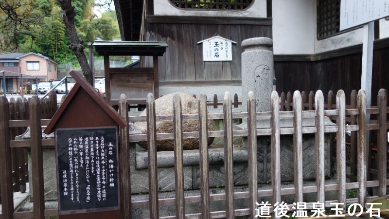 大化改新(645年)によって各国に国府が置かれ、この国府を中心として、道前・道中・道後の名称が生まれました。道中は、国府のある地域を称し、京に向かって国府の前部にあたるところを道前、後部にあたるところを道後と呼んだわけです。従って、中世の道後は、現在の今治市より南を総称したわけですが、近世に入ってからは、温泉の湧く今の道後に限定するようになりました。玉の石は、「伊予国風土記」には、この二神の伝承として大国主命が、重病の少彦名命を助けようとして、大分の速見の温泉を引き湯あみさせたところ、不思議によみがえり、立ち上がった少彦名命が踏んだ石に足跡が残ったという伝承があります。