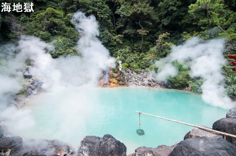 今から約1200年前、貞観九年正月、鶴見岳噴火と共に出来た熱泉のひとつが海地獄です。水面が海のようなコバルトブルーに見えることからその名が付けられるようになりました。温度は約98度あり、泉脈まで深さは200メートル以上と言われています。泉質は酸性、水面が青く美しく見えるのは、温泉成分に“硫酸鉄”を多く溶解しているためです。