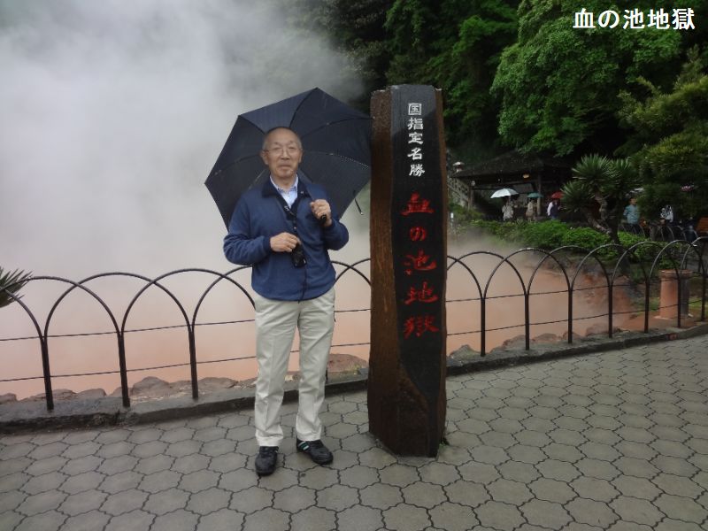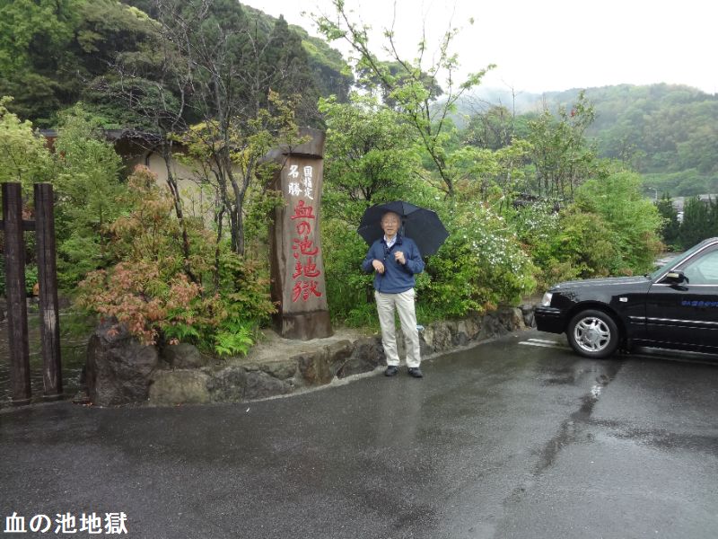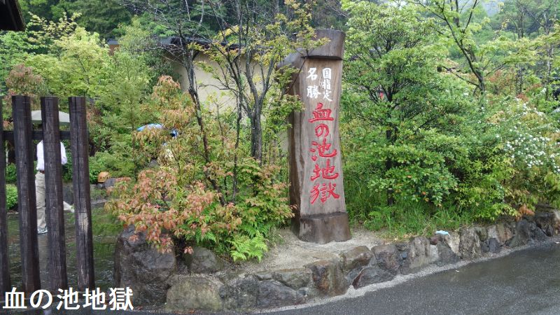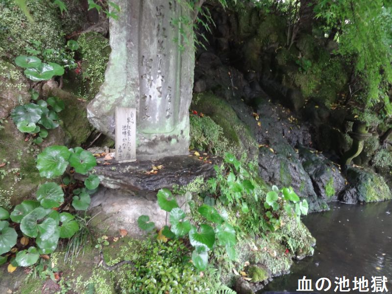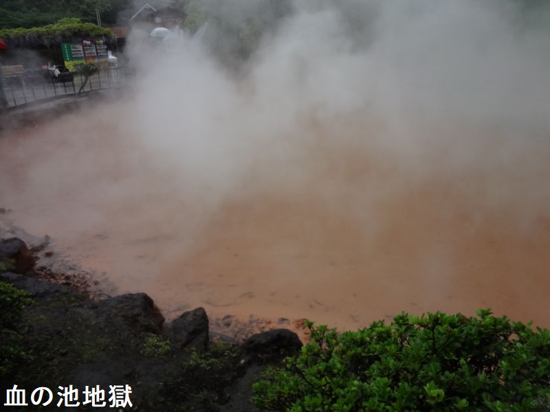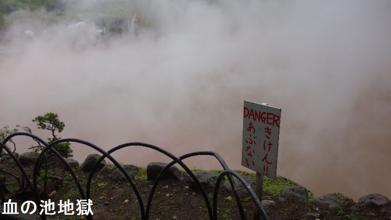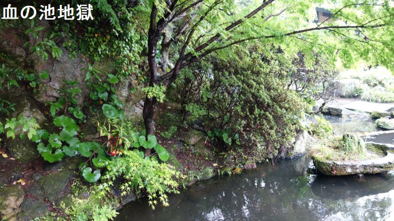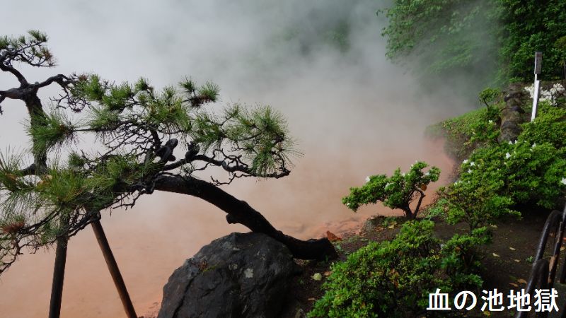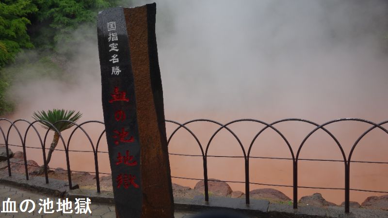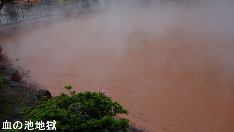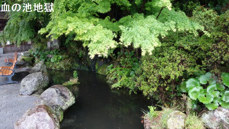 大分県別府市大字野田にある、温泉が湧出する池。JR日豊本線亀川駅の西南西・約1.5kmにあります。池の浅瀬に堆積した沈殿物が“赤い血の色”に見えるので、この名で呼ばれるようになりました。国の名勝に指定されています。血の池地獄は、かつてはたびたび爆発を起こし、周囲の山にも被害をもたらしていたと云います。その後、爆発を防ぐために池のかくはん作業を行うようになり、爆発は起こらなくなりました。近くには、血の池の源泉からそのままひいた掛け流しの足湯「血の池足湯」もあります。