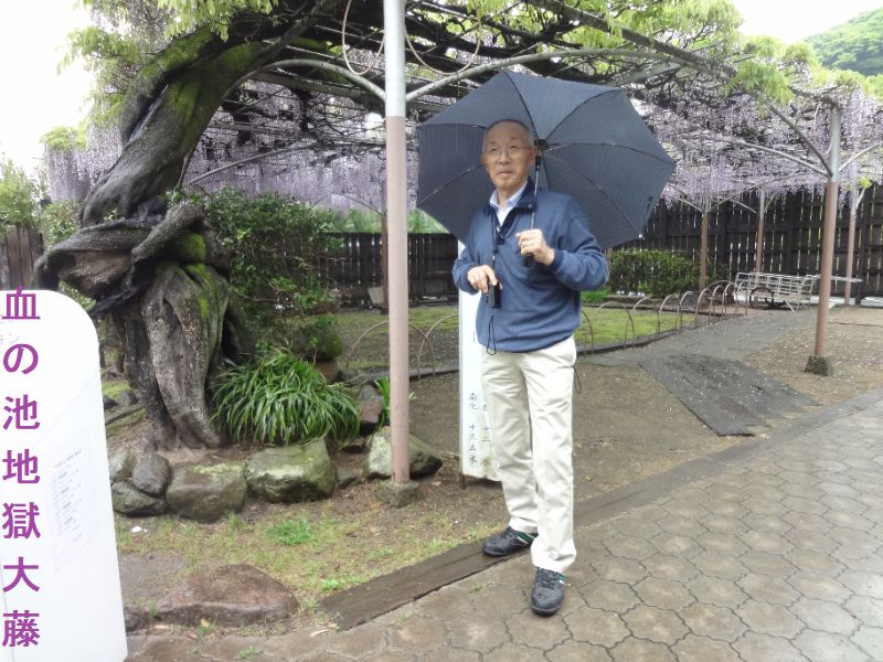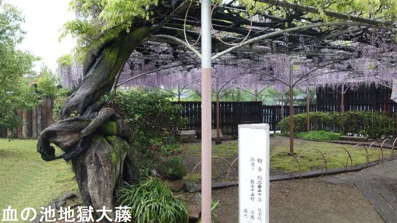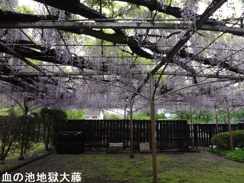 血の池地獄の園内には、樹齢約250年の大藤があります。天然記念物に指定されています。幹周りは175センチ、枝面積は162平方メートル。東西12メートル、南北1135メートルの大棚です。