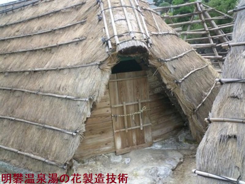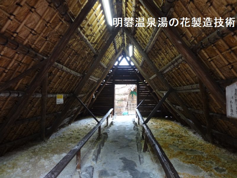 次に噴気孔から小屋床まで土管を延ばして噴気を取り入れます。この土管の途中には噴気が抜ける穴をつけておき、取り込む噴気の量を調節できるようにしておきます。次に小屋床に縦横に溝を掘って噴気道をつけ、噴気がまんべんなく行き渡るようにします。噴気道の先には排出用の土管を設置し、ここでも噴気の排出量を調整できるようにします。さらに小屋床の表面に噴気が一定の強さで噴き出すように栗石と呼ばれる小石を敷き詰めます。最期に小屋床一面に藁を敷きつめて、その上に土を敷いて木槌などで叩いて固めます。屋根は、まず、小屋床の周囲に柱台となる石を配置し、その上に柱を立て切り妻屋根の形につくり、藁や芽で葺く。屋根の高さは高いところで4メートル程です。こうして完成した湯の花小屋の内部は、小屋床から噴気が一定の強さでまんべんなく噴き出し、内部の温湿度も常時一定に保つことができるようになっており、また雨風を防ぐこともできることから、湯の花の結晶ができやすい環境になっています。