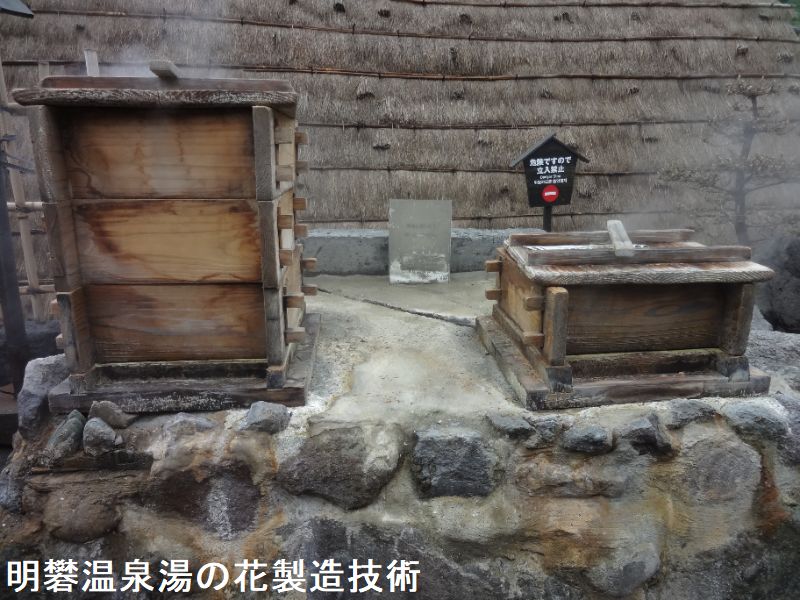 湯の花も享保年間(1716年~1736年)には製造されていたといわれ、明治以降、安価な中国産に押されて明礬が製造されなくなると、湯の花の製造のみが続けられてきました。湯の花の製造工程は、湯の花小屋づくりと小屋の内部で湯の花を結晶化させる作業に大きく分けられます。さらに湯の花小屋づくりは小屋床の製作と屋根の製作に、湯の花を結晶化させる作業は青粘土の敷きつめと噴気の調節と湯の花のかきとりに分けることができます。これらの作業に要する人数は特に決まっていませんが、湯の花小屋づくりは数人で行う場合が多く、湯の花の結晶を作りだす作業は1人で行うこともあります。明礬温泉一帯は、地熱地帯で地下30cmほどのところに温水脈があり、随所に温泉の蒸気である噴気孔を探して、その近辺一帯60平方メートルほどをスコップや木槌を使って平らに固めて基礎とします。