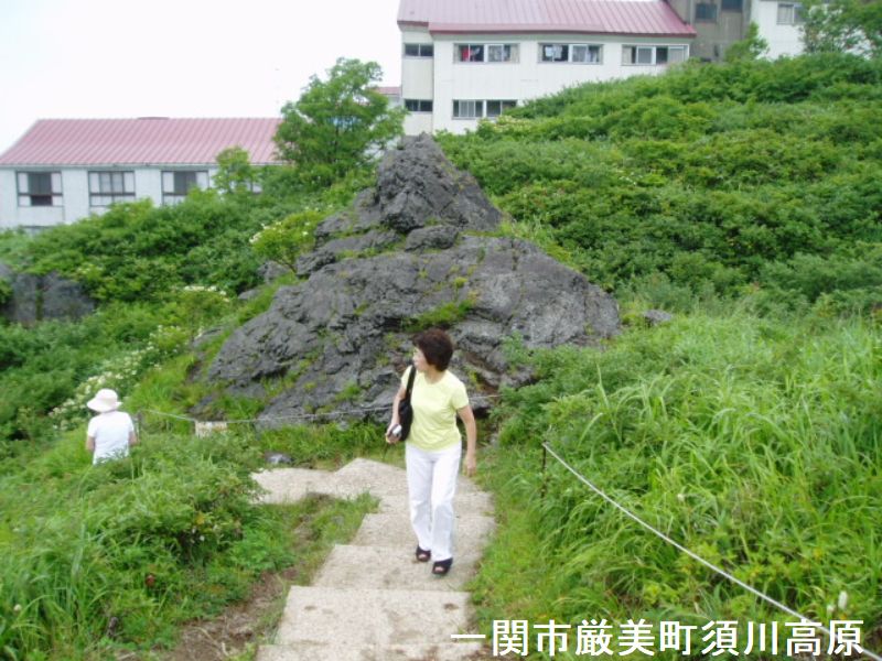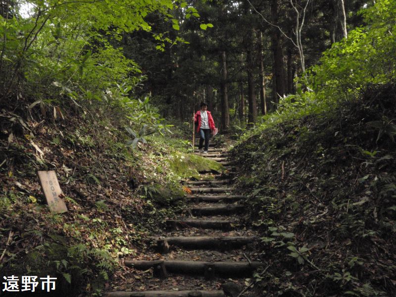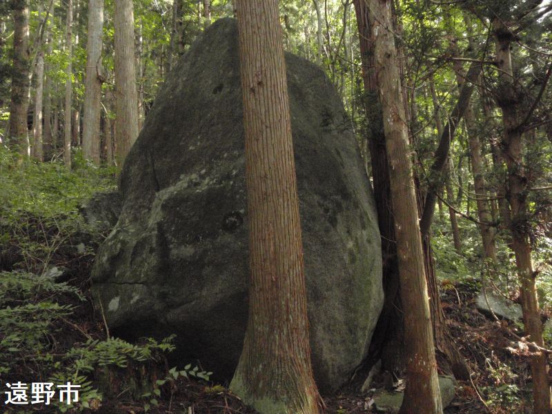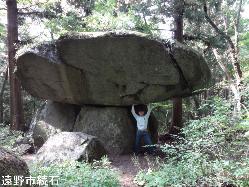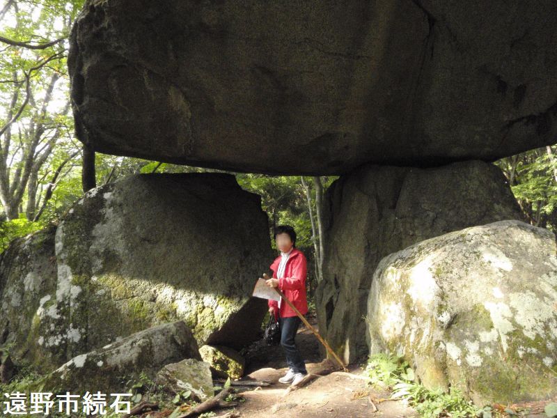 鳥居をくぐり、山の小道を15分ほど登ると、杉林の小高いところに鳥居状の巨石の創造物に出会います。2つ並んだ石の上の、左側の方のみに幅7メートル、奥行き5メートル、厚さ2メートルほどの巨石が笹石として乗っています。「遠野物語」の第91話に出てくる奇石で、古代人の墓とも、武蔵坊弁慶が持ち上げて作ったともいわれています。柳田國男の『遠野物語拾遺』第11話に、この続石に関する伝説が集約されています。この不思議な石の造型は自然のものではなく、弁慶がこさえたものであるという。初め弁慶は近くにある別の石の上に、笠となる石を乗せた。ところが、乗せられた石は「自分は位の高い石なのに、その上に石を乗せられたままとなるのは残念である」と言って一晩中泣き続けた。ならばと弁慶は別の石を台石として、その笠石を乗せ直したという。そして泣き続けた石もこの続石のそばにあり、泣石と呼ばれている。またこれらの巨石がある場所に少しだけ開けた平地があるが、ここは“弁慶の昼寝場”と伝えられている。