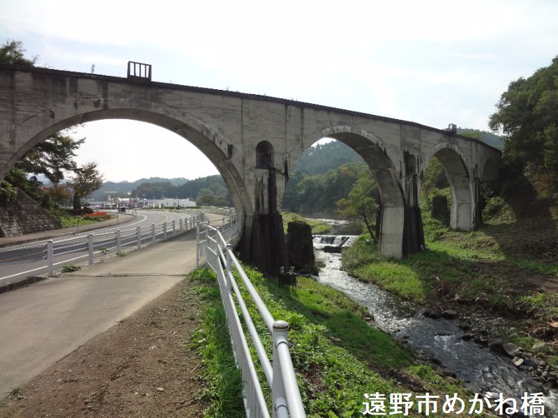 宮守川橋梁は、岩手県遠野市宮守町下宮守にある鉄道橋です。東日本旅客鉄道釜石線の鉄道用アーチ橋であり、国道283号と宮守川を跨いでいる。別称として、愛称の「めがね橋」があります。JR釜石線の通称「めがね橋」は、半円が五つ連なるアーチ橋で、正式名称を「宮守川橋りょう」と言います。JR釜石線の前身である岩手軽便鉄道は、宮沢賢治の童話「銀河鉄道の夜」のモチーフになったとされ、春、夏、冬の観光シーズンに緑色や橙色でライトアップされためがね橋は、道行く人を幻想の世界へと誘います。平成21年4月、恋人の聖地として認定されました。