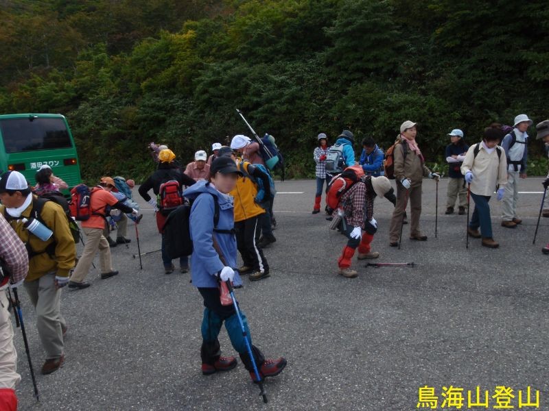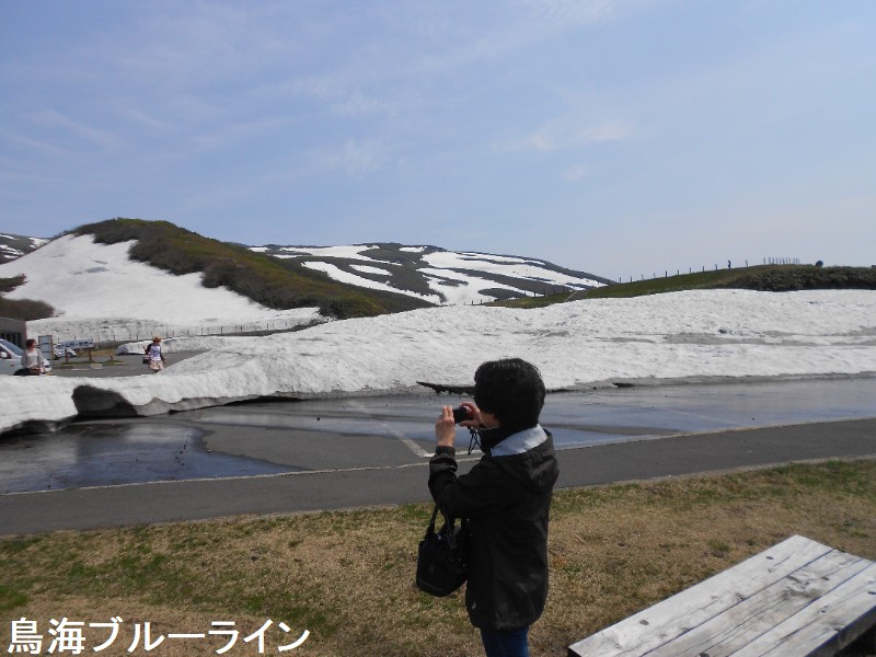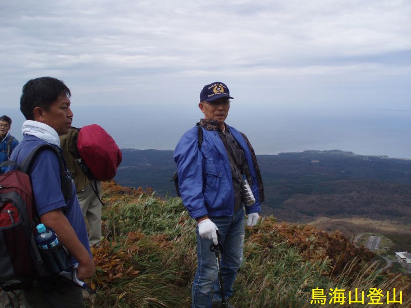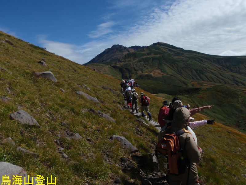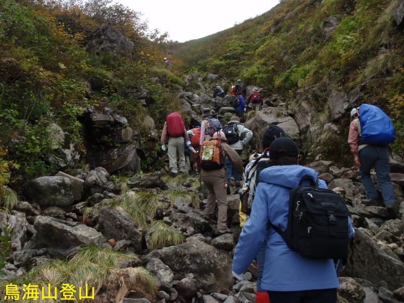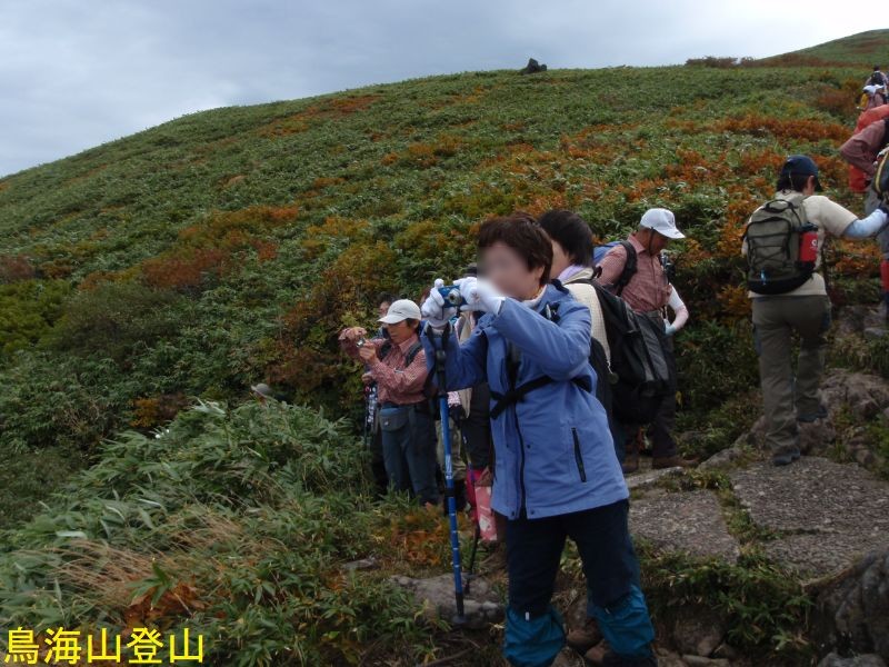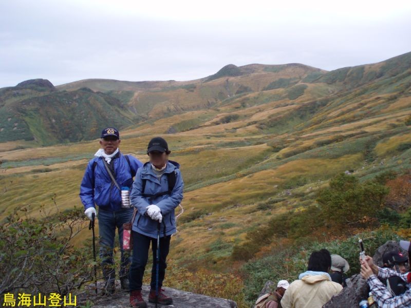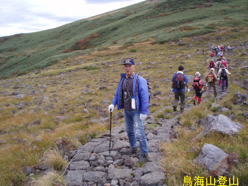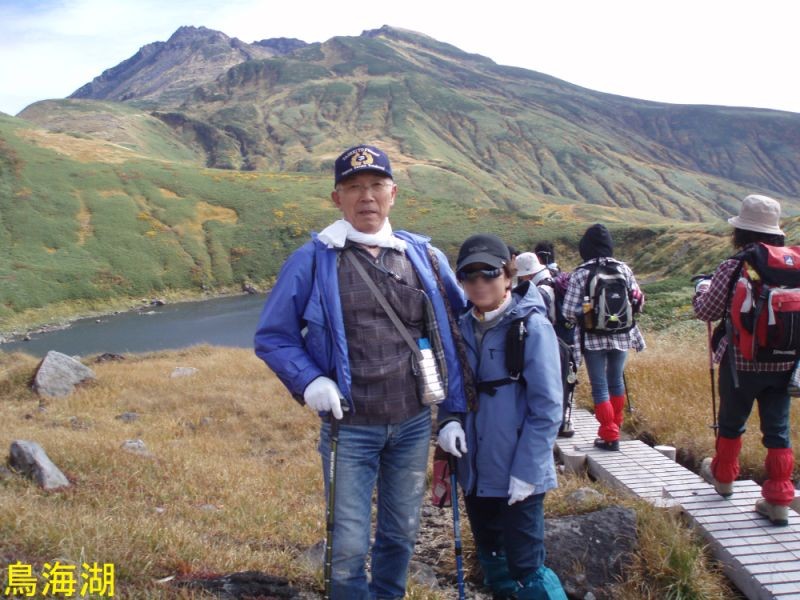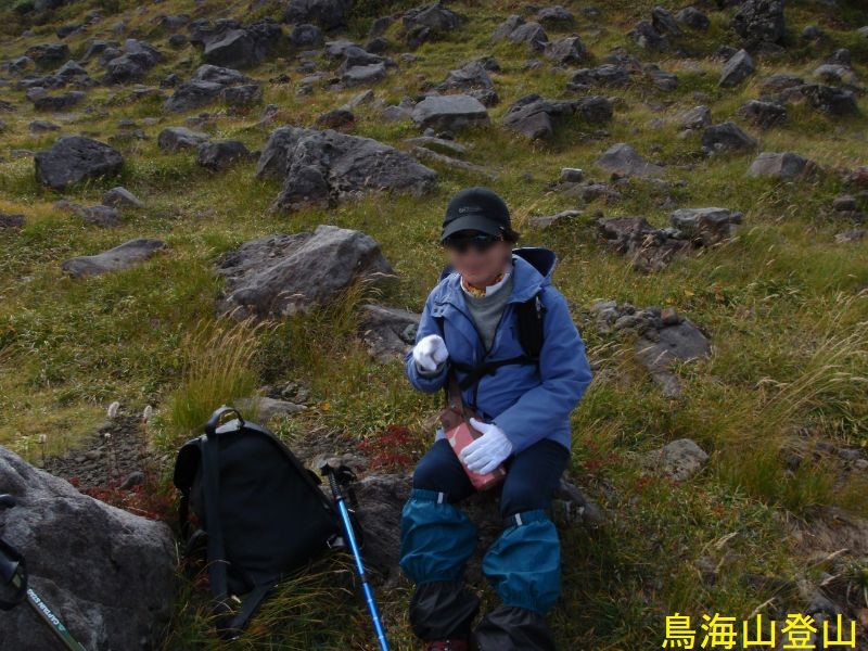 鳥海湖は、鉾立の登山口からおよそ2時間の鳥海山7合目御浜神社付近より南側に展望することができます。湖面の海抜は約1600mで、南北にやや長い楕円形で直径約200mの火口湖です。ステージⅡの約16万年前の火山活動の時の火口で、この時の溶岩はここから西側の山体をほぼ覆っています。北東を扇子森、南西を鍋森が囲んでいて、御浜神社を経由する登山道を尾根筋にして馬蹄形に開いています。水は降り積もった雪がとけたもので、冬季には湖底(一番深いところで4.7m)まで凍結します。ph4.7で酸性が強くあまり生物はいないのですが、クロサンショウウオなどが生息しています。この付近は残雪も多く、雪解けを追って高山植物が咲き誇ります。古来は「鳥ノ海」と称されていました。