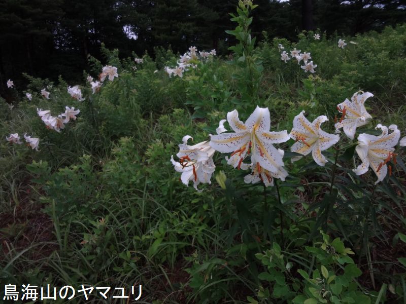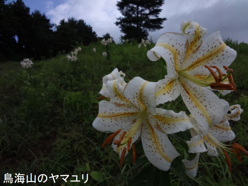 山ユリは、直径20~26cmもある白い大きな花が咲きます。世界のユリのなかで、最も大きな花をつけ、ユリの王様といわれています。花には、強い香りがあります。地下に大福もちのような形の鱗茎があります。茎は鱗茎から1本直立し、葉は長さ15~20cm、幅2.5~5cmで、先が尖っています。花は茎の先に1~6個付きますが、多いものでは、20個も付きます。花は先がそり返った6枚の花被片からできています。鳥海山には至る所に群生して育っています。水汲み場近くのスキーゲレンデにも数多く群生しています。