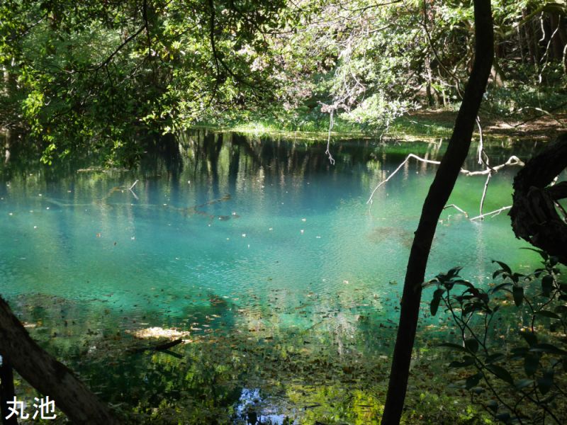 丸池は直径約20m、水深約3.5m、ほぼ100%の湧き水で、湖底で砂が巻き上がる湧き水の姿を見ることができます。こちらも水温は年間を通してほぼ11℃と一定で、池に沈んでいる樹木もなかなか腐敗しません。エメラルドグリーンに輝く水面が神秘的で、畏敬の念を込めて丸池様と呼ばれています。ほとりには丸池を御神体とする丸池神社があり、2008年に国史跡に指定されています。