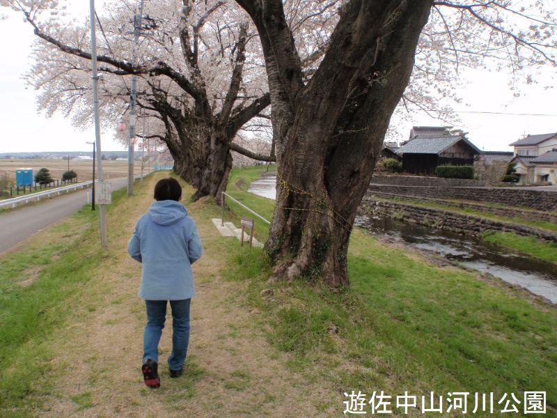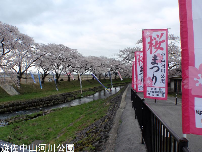 中山集落のそばを流れる洗沢川左岸堤防に桜が植栽されています。この桜は昭和34年に皇太子御成婚記念として60本あまりが植栽されたものです。桜並木の美しさと合わせて、下流から眺めると残雪を被った鳥海山が背景に現れ一枚の絵のような景色になります。そのため多くの観光客やカメラマン、画家の皆さんでにぎわいます。花見の時季には提灯がともされ、風情のある夜桜も楽しめます。
