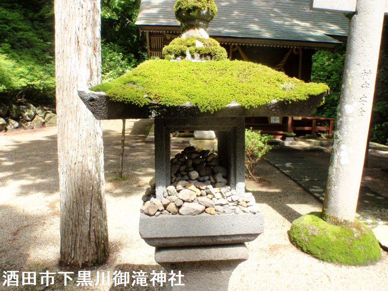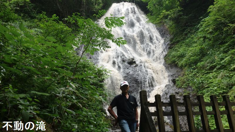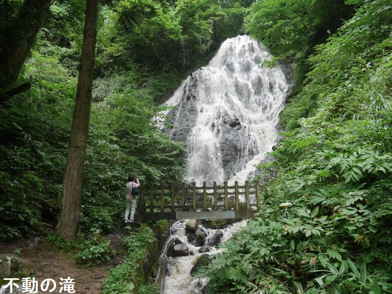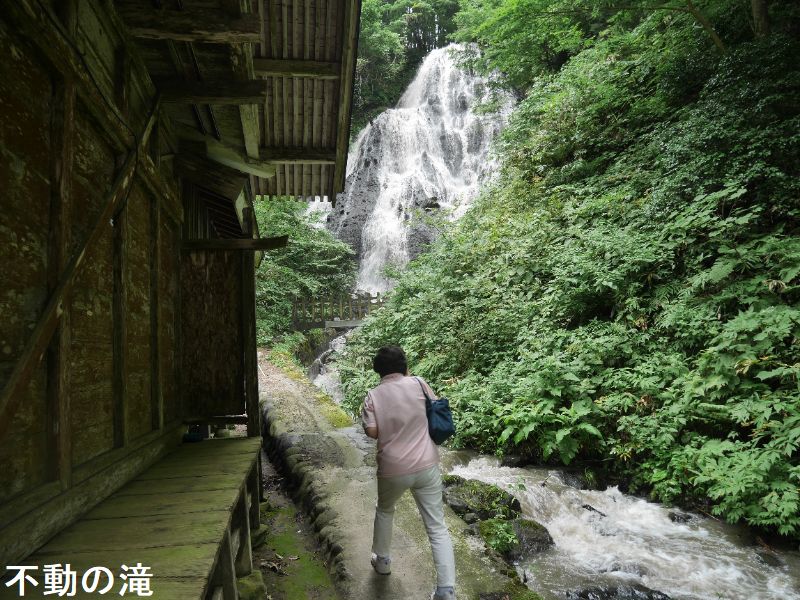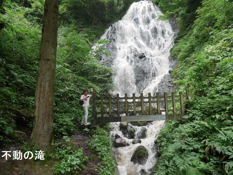 黒川地区の御瀧神社の背後に位置する落差約20mの不動の滝は、切り立った崖の上から水が流れ落ち、流量も豊富で一年中流れが絶えることがありません。不動の滝の周辺の地層は約60万年前の鳥海火山のステージ1のころの火山灰や火山礫などの火山噴出物が堆積した天狗森火砕岩と呼ばれていて、主に火山灰を主体とし火山岩塊や火山礫を含む凝灰角礫岩や火山角礫岩からできています。滝の水はせり出した岩肌を分岐しながら落ちていき、三方に拡がる末広がりの流れになっていて、地元では開運出世の滝として親しまれています。受験シーズンにはたくさんの受験生や保護者の方が訪れています。