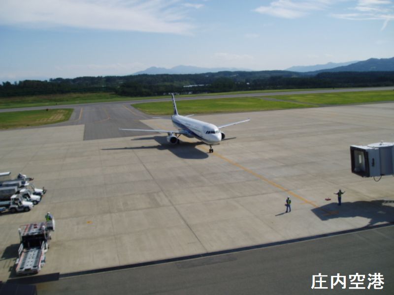 庄内空港は、山形県庄内地方の酒田市と鶴岡市にまたがり立地する地方管理空港です。空港ターミナルビルは酒田市浜中に所在しています。愛称は「おいしい庄内空港」です。庄内米の柔らかい曲線をモチーフにデザインされたターミナルビルは、庄内地方の空の玄関口として、全国各地との高速ネットワーク発展の一翼を担う施設で、観光物産情報コーナーや休憩所(Tre Plads)を始め、お土産店、レストラン、キャッシュコーナーがあり、地場産業、経済、文化の振興にお役に立てる地域のコミュニティプラザとして、皆様のニーズと期待に応えられるよう努めております。