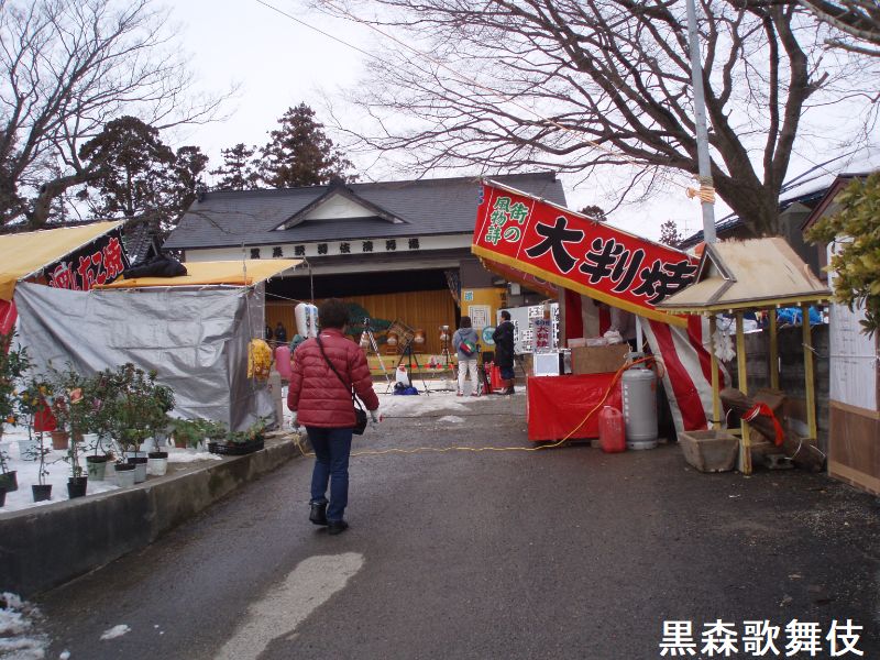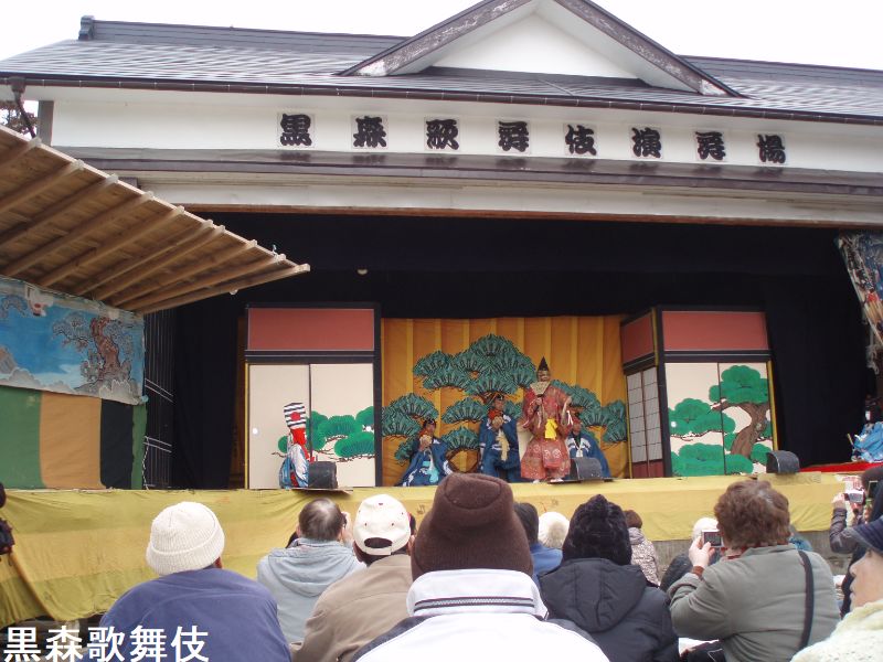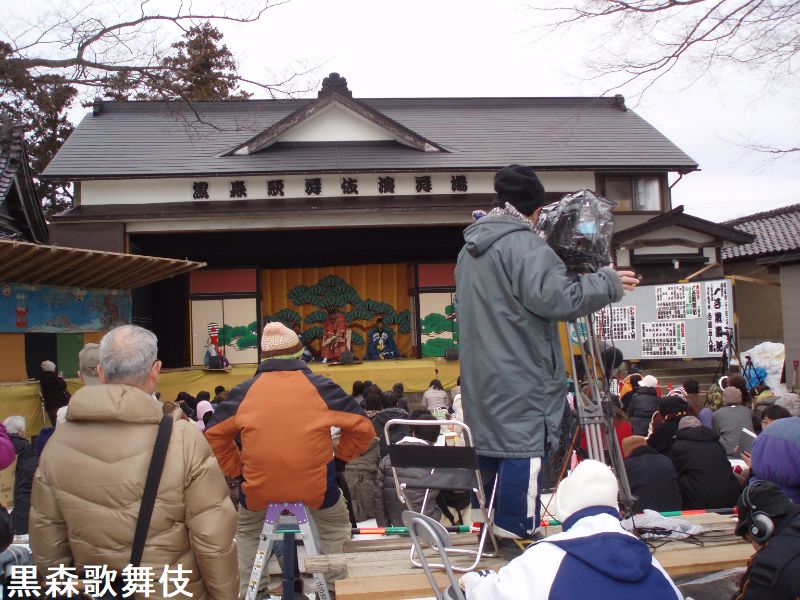 黒森歌舞伎は、酒田市黒森地区において、江戸時代中期の享保年間から280年以上もの間継承されてきた農民歌舞伎で、昭和51年8月9日、山形県無形民俗文化財の指定を受けました。地元住民で組織される「妻堂連中」という一座を中心に地域で受け継がれ、2月15・17日に鎮守日枝神社で正月公演として上演されています。2月の正月公演まで、1年を通じて黒森地域の祭礼と結びついた様々な行事が行われ、厳冬の季節である2月に屋外で上演し、見物席には屋根もないという方法が変わることなく今日まで続いてきたのは、地元の人々の熱心な信仰心に支えられてきたからに他なりません。「雪中芝居」としての伝統と魅力を、地域一体となって守り、伝えていきます。